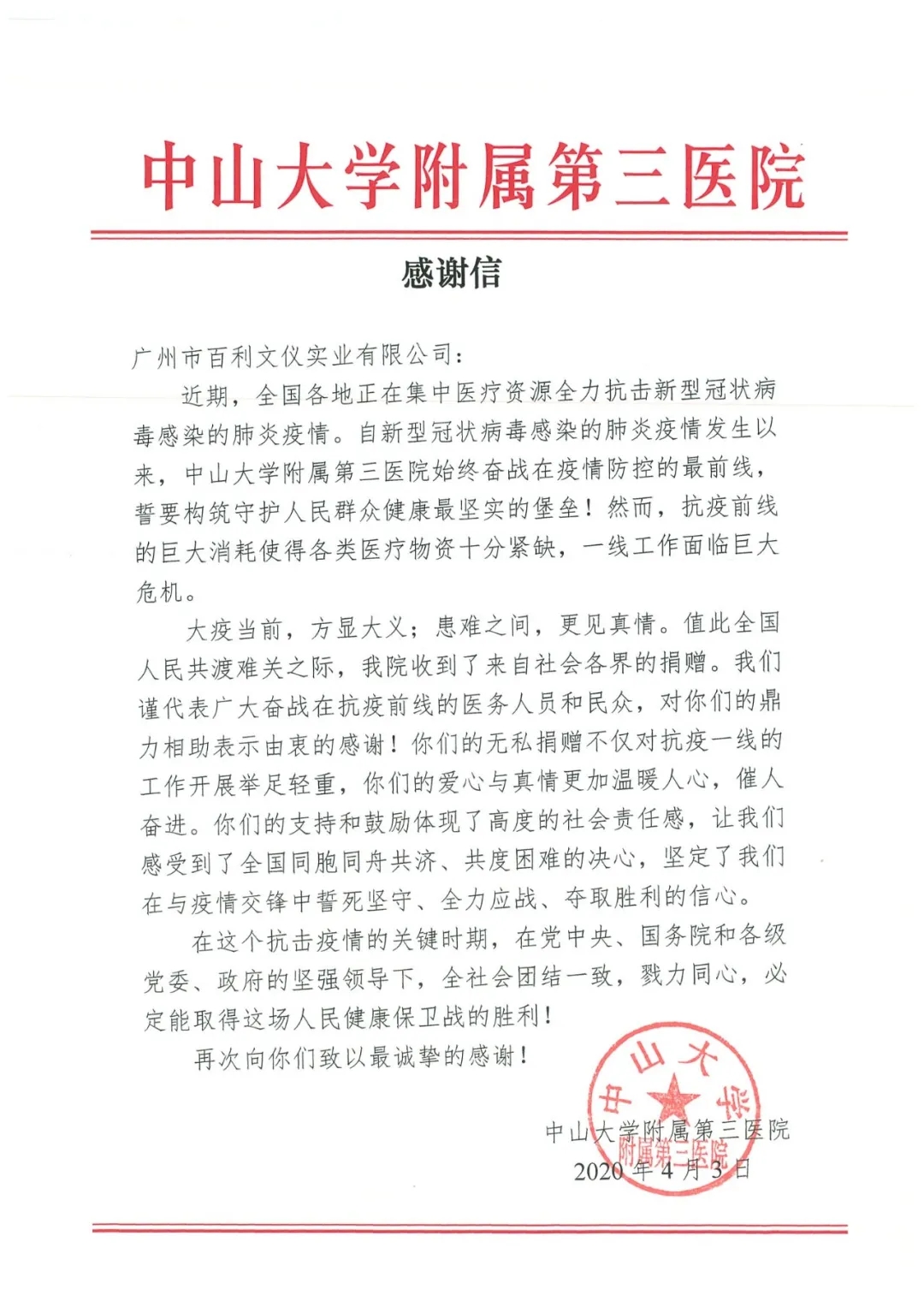 中山大學(xué)附屬第三醫(yī)院感謝信