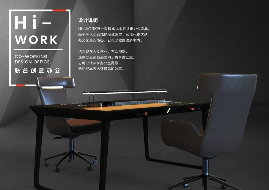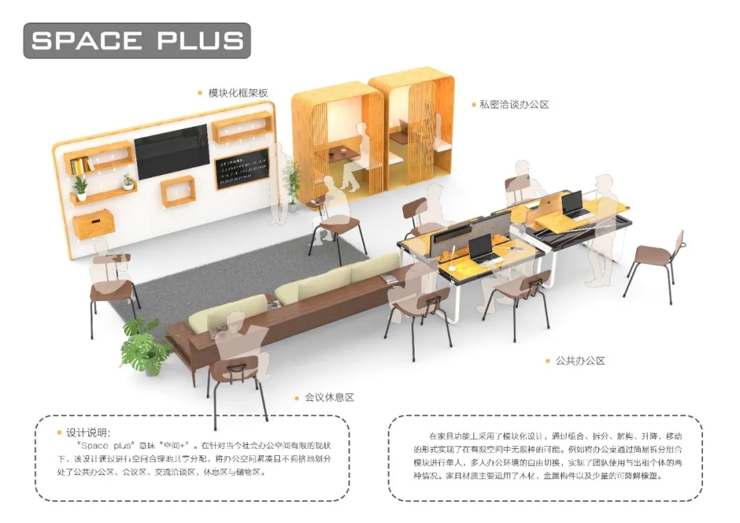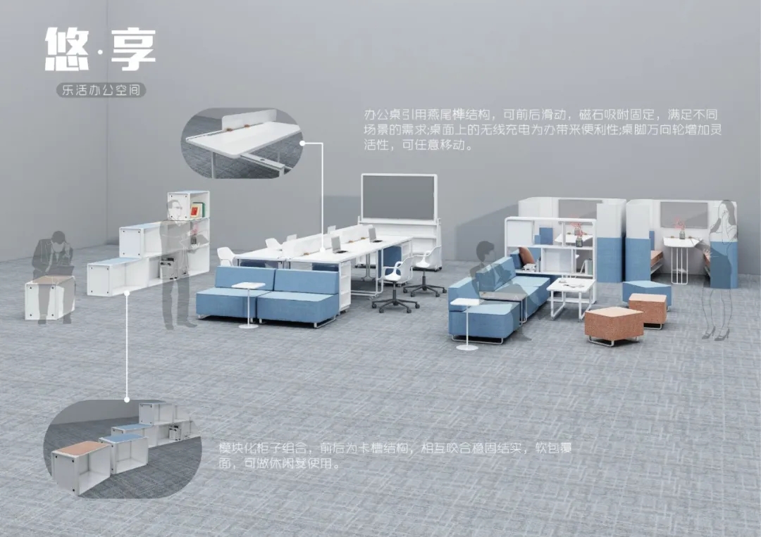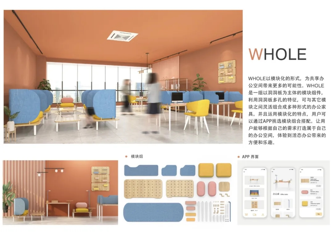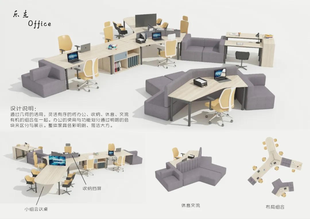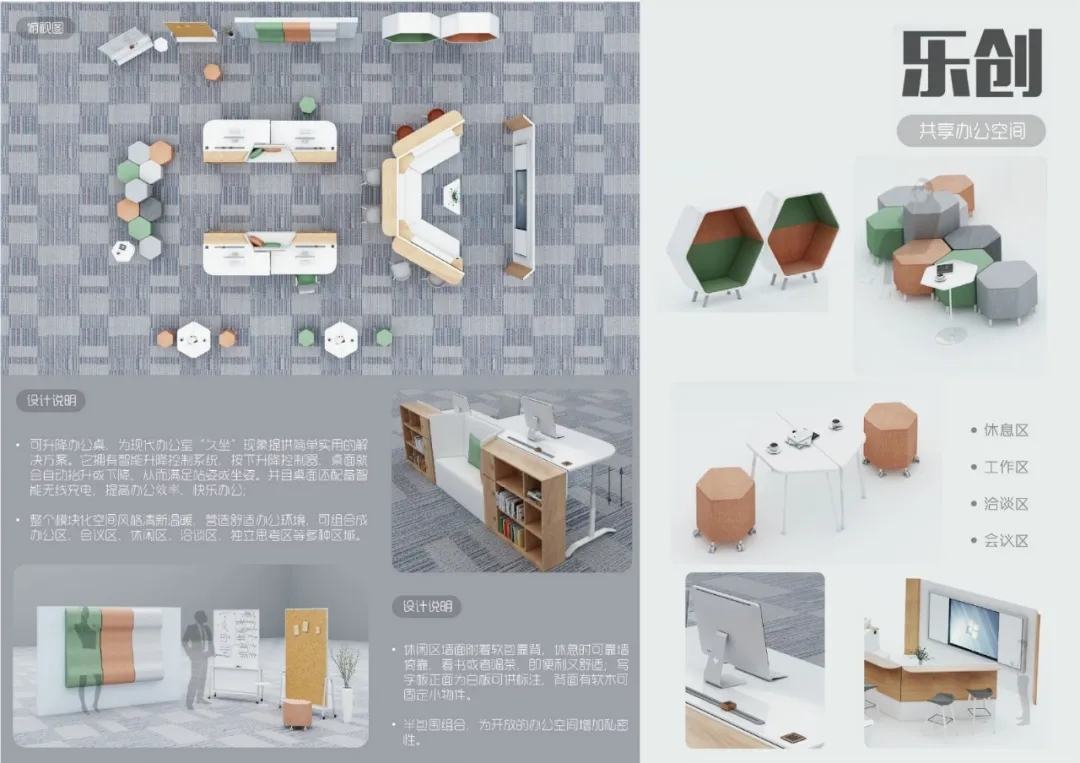 作品的策劃與大賽主題的整體關(guān)系,有清晰的創(chuàng)作概念示意圖,滿足共享辦公需求的辦公家具設計作品。